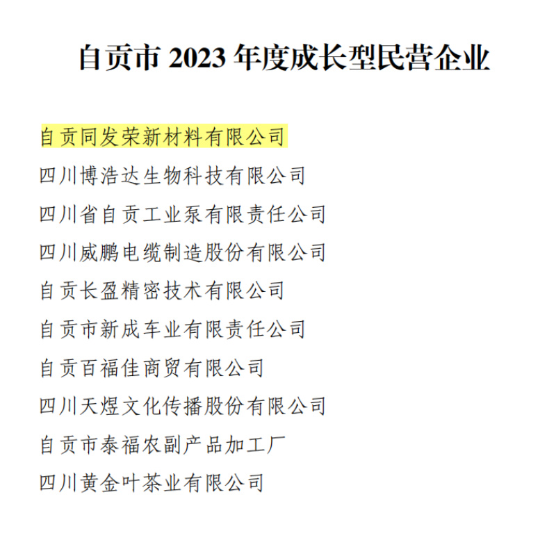 | 自貢同發(fā)榮新材料有限公司 榮獲2023年度成長型企業(yè) |